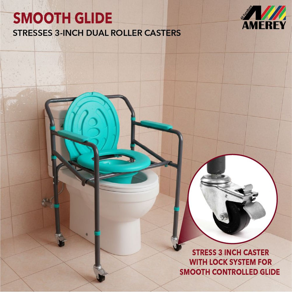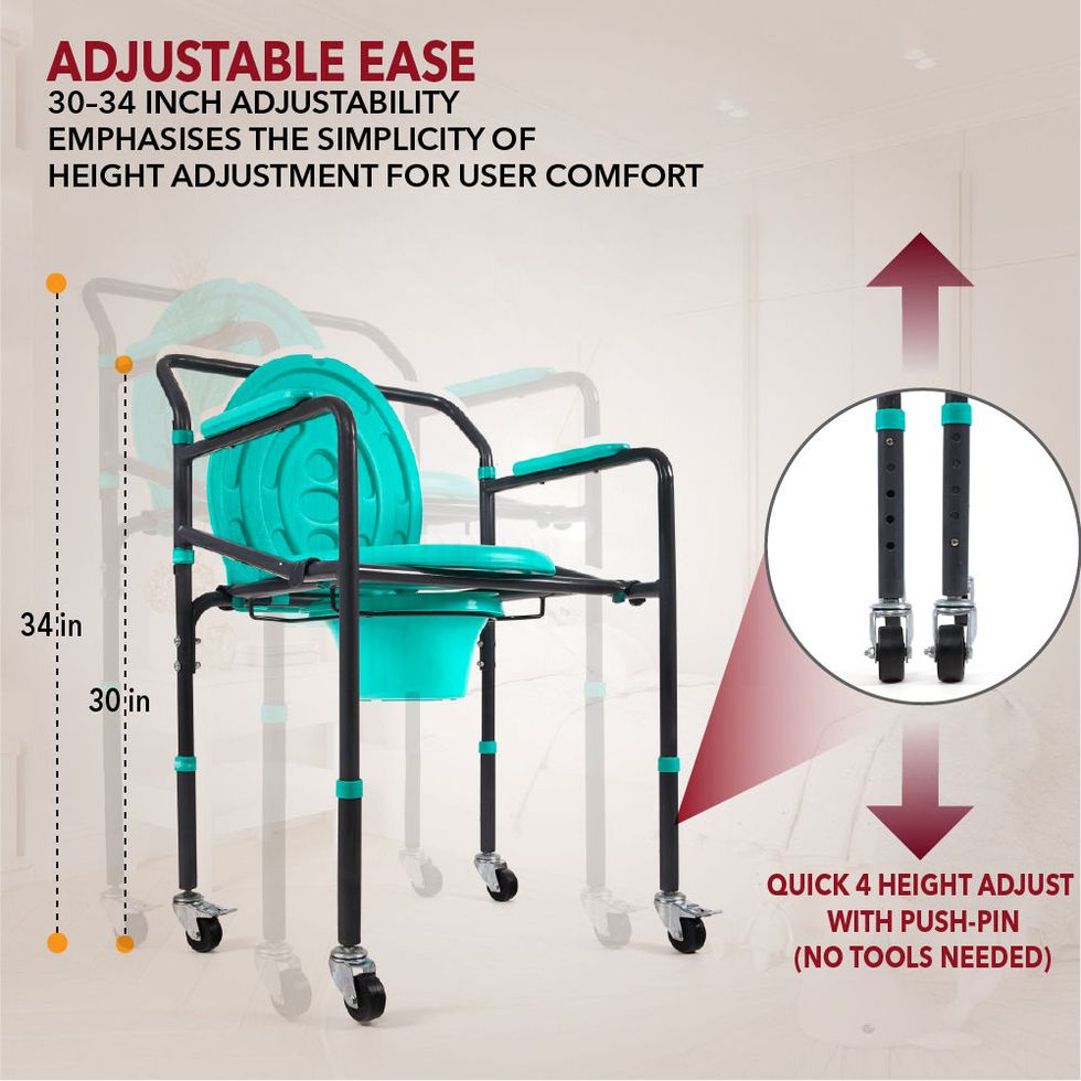 This lightweight folding commode chair combines a durable powder‑coated steel frame with smooth‑rolling metal caster wheels for effortless mobility. Featuring a hygienic molded PVC seat with removable bucket, padded armrests, and height‑adjustable design, it folds in one step for quick storage and transport.