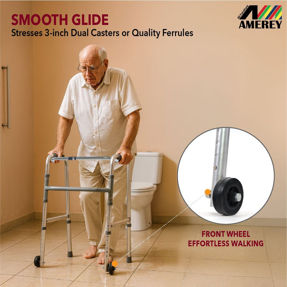 Discover freedom with this lightweight foldable walker — anodized aluminum frame, soft-grip handles, front swivel wheels, non-slip rear tips, and quick push-button height adjust. Travel-ready and supports up to 120 kg.